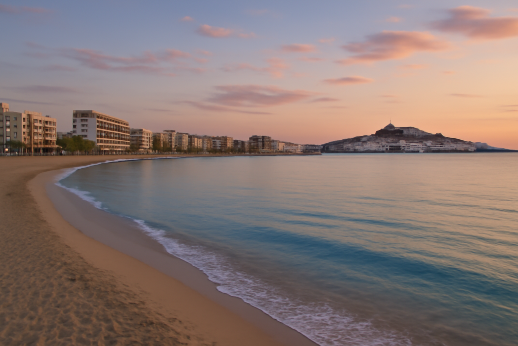 Talamanca Beach offers a stunning view of the city of Ibiza and the coastline, with the sun setting over the sparkling waters.